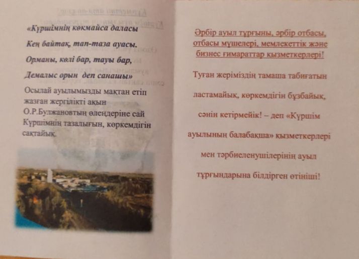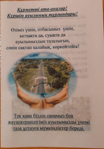 2-ші қадам: ауыл тұрғындарына , ата-аналарымызға ауыл тазалығына, табиғатына ұқыпты қарауға шақыратын сурет-парақшаларды тарату.