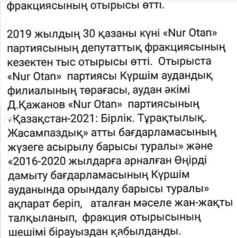 "Nur Otan" партиясы депутаттық фракциясының 2019 ж кезектен тыс отырысында Ауданымыздың әр сала бойынша көрсеткіштерінің өсу қарқыны атап өтілді. "2016-2020 ж аралығында Өңірді дамыту бағдарламасын" іске асыру бойынша тапсырмалар берілді.
